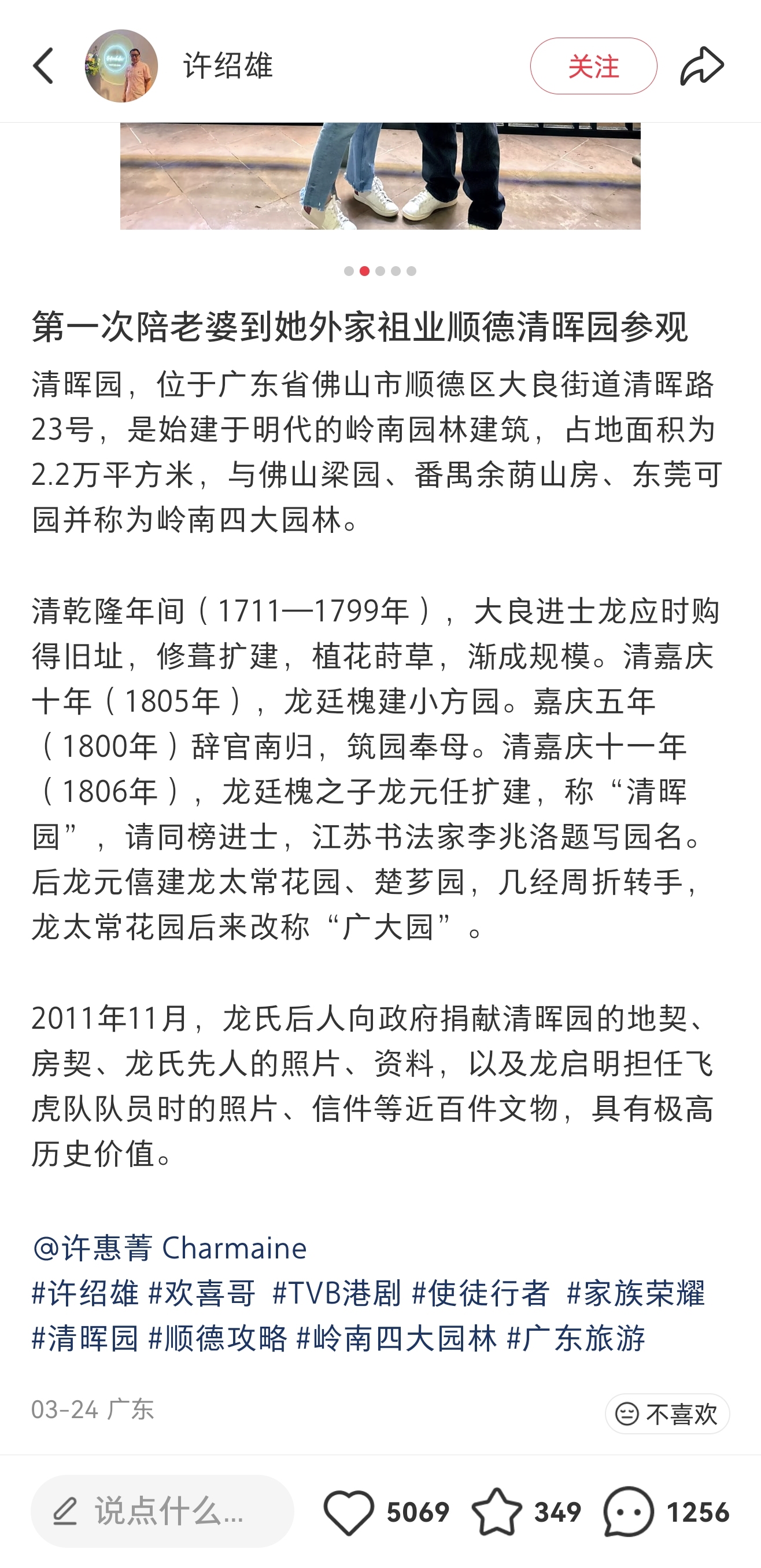 今年3月,许绍雄一家到访清晖园。图源许绍雄社交平台